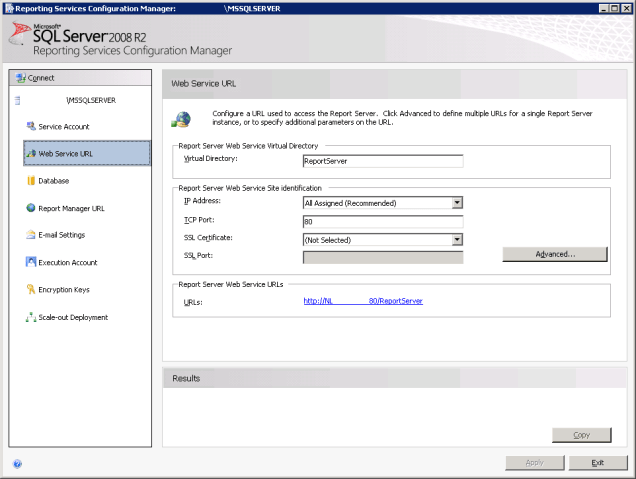 Figure 1. Reporting Services Configuration Manager, Web Service URL.