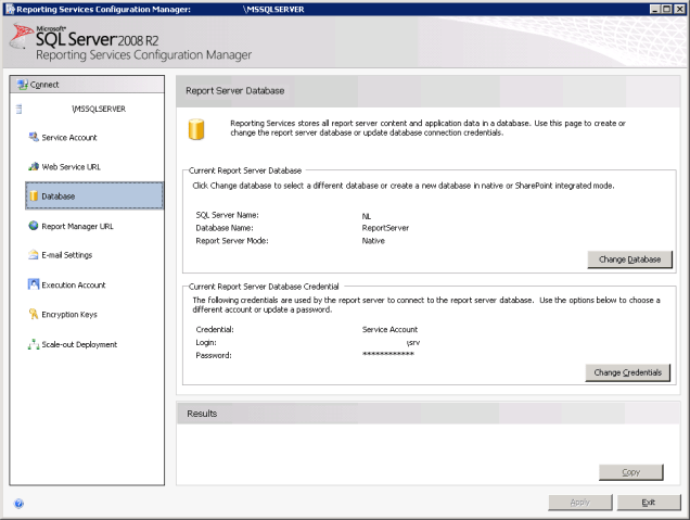 Figure 2. Reporting Services Configuration Manager, Report Server Database.