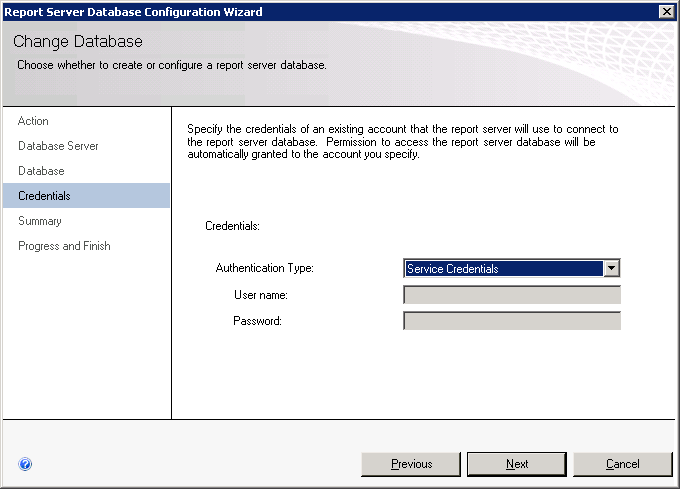 Figure 6. Report Server Database Configuration wizard, specify credentials.