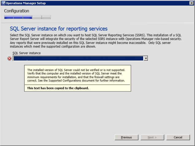 *In the present case the Setup Wizard indicated the following message “The installed version of SQL Server could not be verified or is not supported”. Because this message can have several causes, it is wise to search the log file of the installation to further investigate the message. The OpsMgrSetupWizard log file is located in %:\Users\<USERNAME>\AppData\Local\SCOM\LOGS