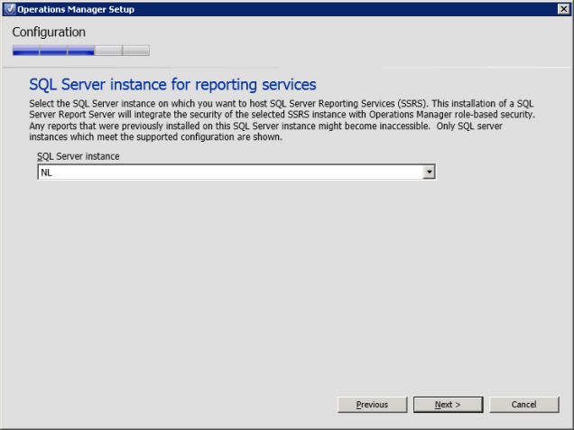 Figure 18. Operations Manager Setup, SQL Server instance for reporting services.