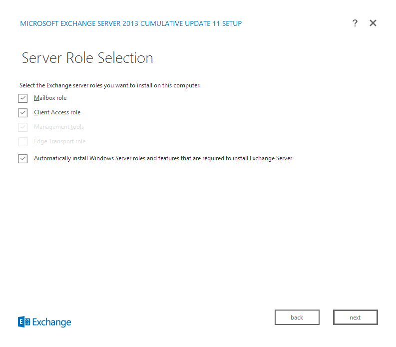 Last but not least check also the “Automatically install Windows Server Roles and features that are required to install Exchange Server”. Hit next.
