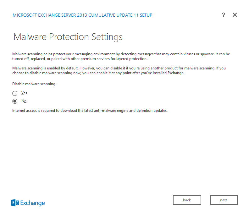 Default Malware Protection is on. If you don’t want to use this check Disable malware scanning Yes. In my case I do want to use malware scanning. Hit next.