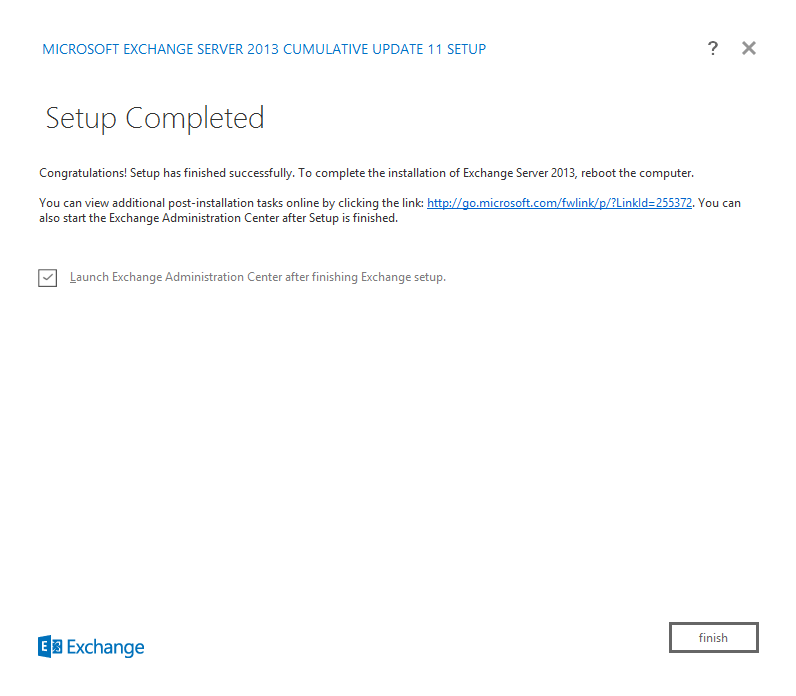 When the Setup has finished, reboot the server to complete the installation of Exchange 2013CU11. Hit finish to close the wizard.