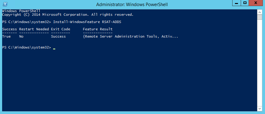 Now it is time to install the Active Directory Management Tools. This can also be done within the Server Manager. For convenience, I choose to install this with PowerShell. Open PowerShell as an administrator and run the following command: Install-WindowsFeature RSAT-ADDS