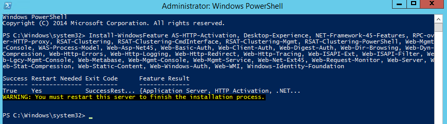 Install-WindowsFeature AS-HTTP-Activation, Desktop-Experience, NET-Framework-45-Features, RPC-over-HTTP-proxy, RSAT-Clustering, RSAT-Clustering-CmdInterface, RSAT-Clustering-Mgmt, RSAT-Clustering-PowerShell, Web-Mgmt-Console, WAS-Process-Model, Web-Asp-Net45, Web-Basic-Auth, Web-Client-Auth, Web-Digest-Auth, Web-Dir-Browsing, Web-Dyn-Compression, Web-Http-Errors, Web-Http-Logging, Web-Http-Redirect, Web-Http-Tracing, Web-ISAPI-Ext, Web-ISAPI-Filter, Web-Lgcy-Mgmt-Console, Web-Metabase, Web-Mgmt-Console, Web-Mgmt-Service, Web-Net-Ext45, Web-Request-Monitor, Web-Server, Web-Stat-Compression, Web-Static-Content, Web-Windows-Auth, Web-WMI, Windows-Identity-Foundation