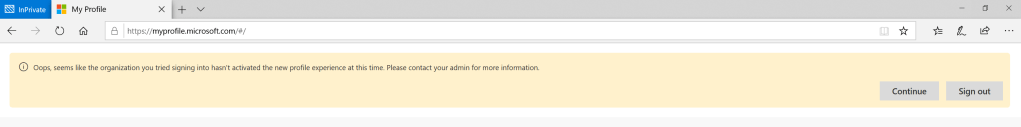 The enhanced security info registration experience is not yet enabled by default. When this feature isn’t enabled users will receive a notification such as displayed in figure 2 when they try to access https://myprofile.microsoft.com.